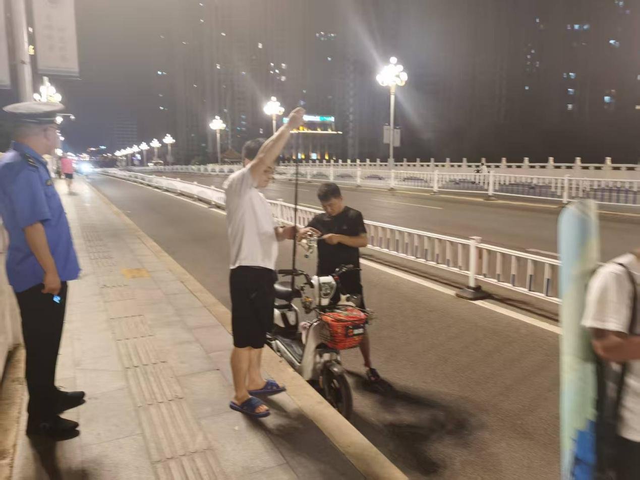“晚上橋面光線不好,來回過往的行人和非機(jī)動車輛也多,您在這兒垂釣實(shí)在是不安全啊,趕快收竿回家吧。”8月3日20時許,在漯河市金山路沙河橋上,經(jīng)開區(qū)城市管理綜合行政執(zhí)法大隊(duì)大隊(duì)長曹陽帶領(lǐng)夜間執(zhí)法人員在轄區(qū)范圍內(nèi)開展橋面垂釣治理行動。
