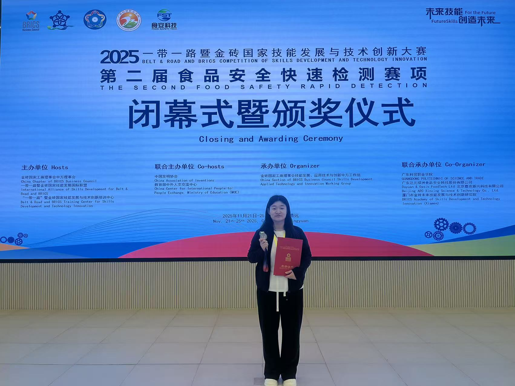 近日,2025“一帶一路”暨金磚國家技能發(fā)展與技術創(chuàng)新大賽“食品安全快速檢測賽項”全國總決賽在廣東科貿職業(yè)學院落下帷幕。漯河醫(yī)學高等??茖W校(以下簡稱“漯河醫(yī)專”)公共衛(wèi)生與健康營養(yǎng)學院教師陳沖憑借扎實的專業(yè)知識和精湛的實踐操作能力,在教師賽中脫穎而出,榮獲二等獎,充分展現(xiàn)了學校在食品安全快速檢測領域的教學實力與人才培養(yǎng)質量。