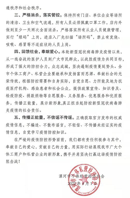 一、高度重視,科學(xué)防控。個體工商戶、私營企業(yè)點(diǎn)多、線長、量大、面廣、人員集聚性強(qiáng),是疫情防控的重要領(lǐng)域和重點(diǎn)環(huán)節(jié)。廣大個體工商戶、私營企業(yè)務(wù)必充分認(rèn)識自身特點(diǎn),加強(qiáng)政策學(xué)習(xí),了解科學(xué)知識,掌握防范措施,規(guī)范自身行為,全面準(zhǔn)確地貫徹落實(shí)漯河市委、市政府的決策部署,堅定信心、眾志成城,積極投身到疫情防控斗爭中去,自覺為全市防控工作做貢獻(xiàn)。