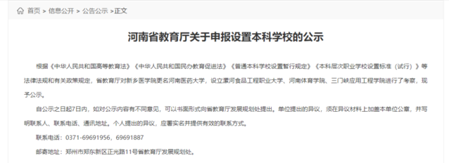 剛剛,河南省教育廳發(fā)布關(guān)于申報(bào)設(shè)置本科學(xué)校的公示,其中提到,省教育廳對(duì)