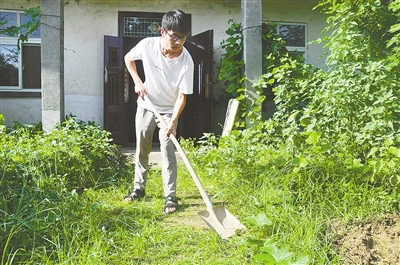 8月25日下午,記者走進(jìn)舞陽(yáng)縣孟寨鎮(zhèn)龍東村王帥斌的家中。院內(nèi)有一條通向堂屋的碎磚路,其他地方種了些蔬菜,剩余地方都是荒草。三間房屋經(jīng)過(guò)危房改造,房頂加固了彩鋼瓦。18歲的王帥斌正手握鐵鍬,鏟除小路上的雜草。