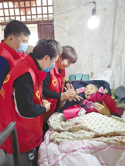 “祝你生日快樂,祝你生日快樂……”給高慶賀老人戴上壽星帽,老人的重孫子與志愿者一起在床前唱起了《生日快樂》歌,老人家高興極了。