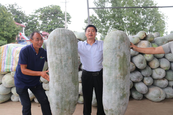 圖為臨潁縣農(nóng)副產(chǎn)品代言人張付慶與150斤重的冬瓜王合影留念