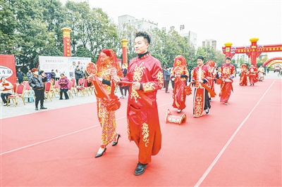 當(dāng)天上午10時(shí)許,在婚禮現(xiàn)場(chǎng),端莊秀麗的新娘們等待著意中人;新郎們?yōu)t灑大方,期待抱得美人歸。吉時(shí)已到,中式婚禮開(kāi)始,先是傳統(tǒng)的大鼓、舞獅表演,接著是新娘入場(chǎng)、新婿登場(chǎng),然后是迎新娘、入華堂、拜天地、交換定情信物、夫妻對(duì)拜、合影等活動(dòng)流程。
