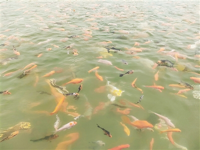 在一方方碧綠的魚池里,一尾尾花紋各異的錦鯉悠然游動。一把餌料撒下去,魚群爭先搶食,正紅、金黃、黑白……擺動著曼妙身姿的錦鯉與波光粼粼的水面相映成趣,構(gòu)成一幅恬淡幽靜的美妙畫卷。