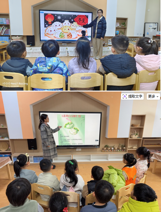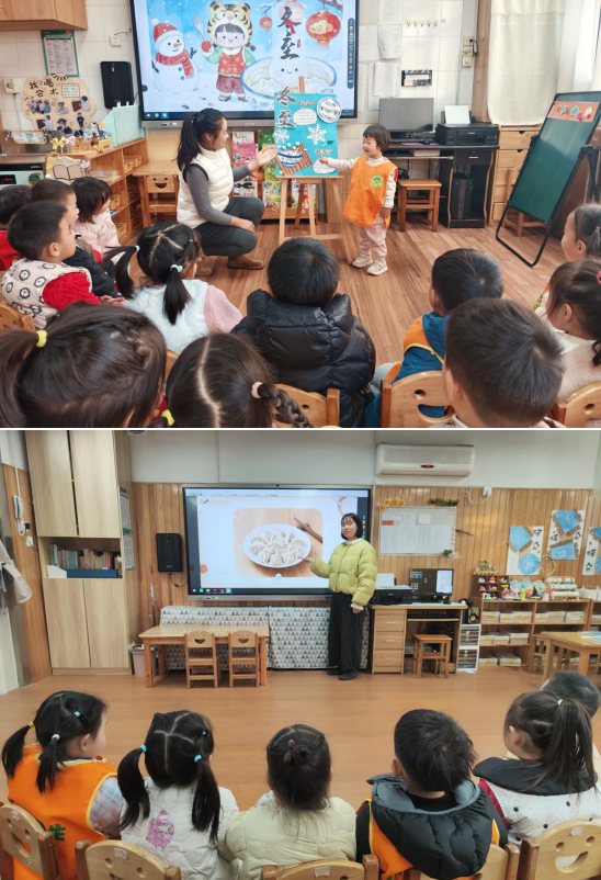 保健醫(yī)也走進了大班課堂,將冬至文化知識與幼兒健康養(yǎng)護巧妙融合。立足幼兒冬季保健需求,保健醫(yī)具體示范“洋蔥式穿衣法”,強調飲食多樣與營養(yǎng)均衡,引導幼兒在了解習俗的同時,建立科學防寒、健康飲食的自我防護意識,讓傳統(tǒng)文化承載著關愛與智慧浸潤童心。