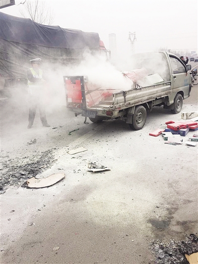 3月12日中午,何先生開著一輛單排小貨車,去臨潁縣北環(huán)路送貨,行至107國(guó)道時(shí),車上突然起火,頓時(shí)黑煙滾滾。“車上拉的是塑料制品和車用工具制品,還有一桶9升液壓油,貨物價(jià)值6萬(wàn)多元。”何先生說,他看見火苗躥起,當(dāng)時(shí)就嚇得六神無(wú)主,心驚膽戰(zhàn)。