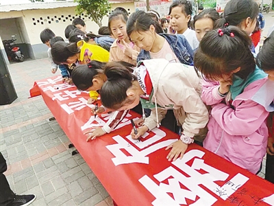 志愿者用一個個實例、一組組數(shù)據(jù),向?qū)W校師生和家長講解防溺水安全知識,提醒學(xué)生們“遠(yuǎn)離危險水域”。隨后,全校師生一起莊嚴(yán)宣誓:珍愛生命,預(yù)防溺水,遠(yuǎn)離危險,平安成長。學(xué)生們還認(rèn)真地在紅色條幅上簽名,表達(dá)“絕不一個人下水游泳”的決心。