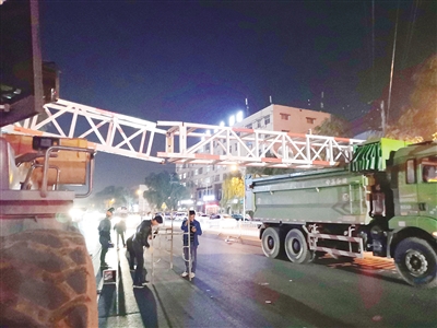 不一會(huì)兒,救援人員趕到現(xiàn)場(chǎng),在限高桿附近擺放警示標(biāo)志,提醒過往車輛和行人小心。隨后,救援人員找來(lái)一輛挖掘機(jī),把鏟斗升起,托著搖搖欲墜的限高桿,防止其墜落。然后,救援人員對(duì)限高桿進(jìn)行修復(fù)。