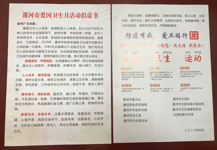 2020年4月是第32個(gè)愛國(guó)衛(wèi)生月,今年的活動(dòng)主題是“防疫有我、愛衛(wèi)同行”。4月3日,郾城區(qū)沙北街道海河社區(qū)組織志愿者深入店鋪、小區(qū)中發(fā)放環(huán)境衛(wèi)生宣傳材料,并結(jié)合當(dāng)前新冠肺炎疫情向大家普及衛(wèi)生健康知識(shí),號(hào)召大家共同行動(dòng)起來,摒棄陋習(xí),養(yǎng)成良好的衛(wèi)生習(xí)慣。