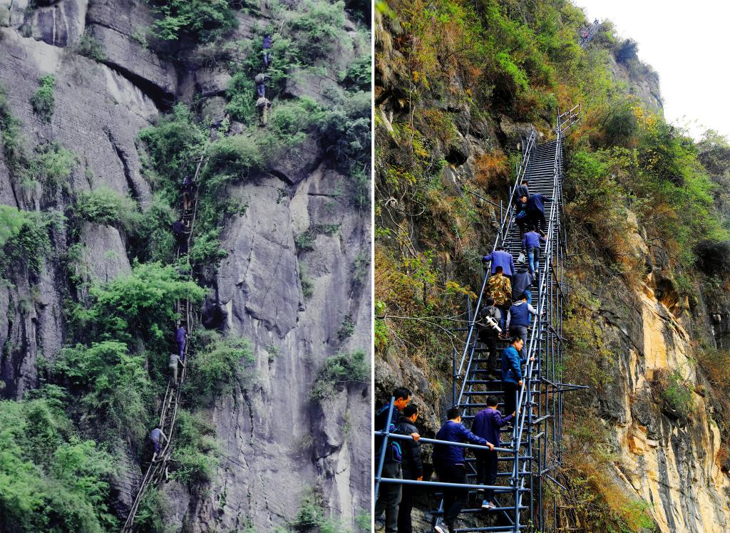 懸崖峭壁上,一個是歪歪扭扭的簡易藤梯,另一個則是改建后同時用于旅游的鋼梯。