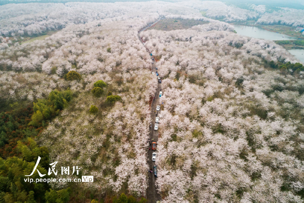 2020年3月22日,在安徽省宣城市郎溪縣十字鎮(zhèn)新和村,漫山遍野的櫻花競相綻放,春意盎然。從空中俯瞰,千畝櫻花花海如云似雪,美景如畫,吸引眾多游客前來賞花踏青。水恒智/人民圖片