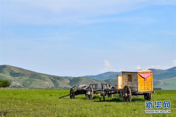 烏蘭毛都草原上的勒勒車(7月1日攝)。 盛夏時(shí)節(jié),內(nèi)蒙古興安盟科爾沁右翼前旗的烏蘭毛都草原綠意盎然,風(fēng)景醉人。 烏蘭毛都草原地處大興安嶺南麓,屬丘陵山地草原,風(fēng)光獨(dú)特。 新華社記者 貝赫 攝