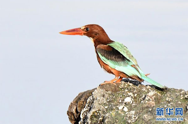 7月7日,在科威特首都科威特城海濱,一只白胸翡翠在鳴叫。 新華社發(fā)(哈齊 攝)