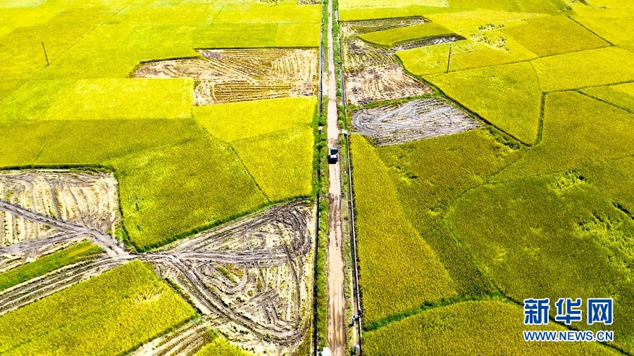 成片的早稻在陽光下金光燦燦。(無人機拍攝)