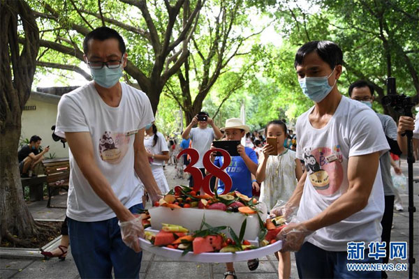 8月16日,參加“新星”38歲生日會的大熊貓“粉絲”在協(xié)助動物園工作人員制作水果生日蛋糕。 當(dāng)日,世界現(xiàn)存最年長圈養(yǎng)大熊貓“新星”迎來38歲生日,重慶動物園為“老壽星”舉行了生日會。“新星”的年齡相當(dāng)于人類的110至150歲,目前身體狀況良好。 大熊貓“新星”1982年出生于四川寶興縣野外,1983年來到重慶動物園。 新華社記者 唐奕 攝