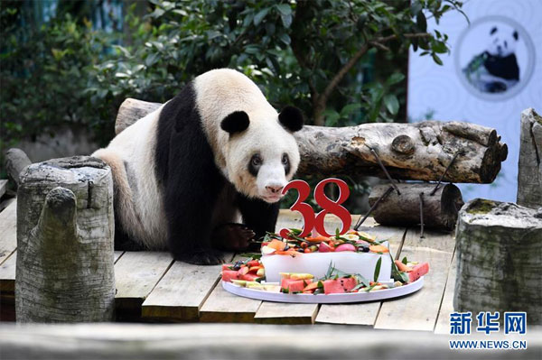 8月16日,大熊貓“新星”在38歲生日會上享用水果生日蛋糕。 當(dāng)日,世界現(xiàn)存最年長圈養(yǎng)大熊貓“新星”迎來38歲生日,重慶動物園為“老壽星”舉行了生日會。“新星”的年齡相當(dāng)于人類的110至150歲,目前身體狀況良好。 大熊貓“新星”1982年出生于四川寶興縣野外,1983年來到重慶動物園。 新華社記者 唐奕 攝