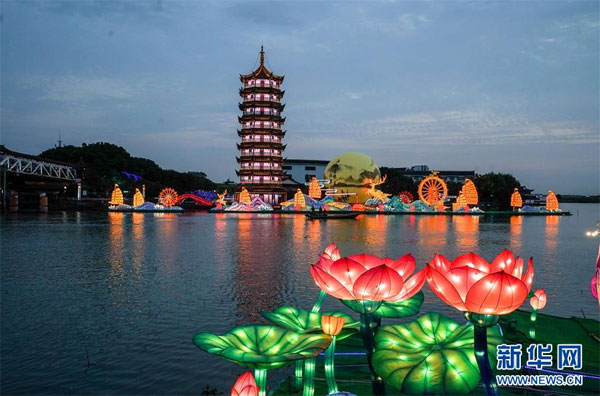 9月28日拍攝的“情意綿綿”燈組(前右)與“月滿周莊”燈組(后左)。 當(dāng)日,2020海峽兩岸(昆山)中秋燈會(huì)在江蘇昆山開(kāi)幕,為期一個(gè)月。燈會(huì)設(shè)置的水鄉(xiāng)周莊燈區(qū)以水鄉(xiāng)、古鎮(zhèn)、田園江南為依托,將傳統(tǒng)彩燈與現(xiàn)代光影藝術(shù)相融合,打造“水韻芳華”夜周莊。 新華社記者 楊磊 攝