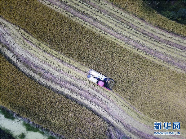 9月26日,花崗鎮(zhèn)河豐社區(qū)農(nóng)民駕駛收割機(jī)收割水稻(無人機(jī)照片)。 近日,安徽省肥西縣花崗鎮(zhèn)河豐社區(qū)水稻陸續(xù)成熟,當(dāng)?shù)剞r(nóng)民搶抓晴好天氣收割水稻,力爭(zhēng)讓稻谷顆粒歸倉。 新華社記者劉軍喜攝