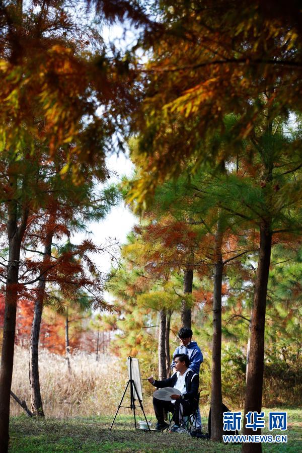 11月15日,繪畫愛好者在江蘇省泗洪縣洪澤湖濕地的杉樹林中寫生。初冬時節(jié),洪澤湖濕地中的杉樹林猶如披上多彩外衣,色彩斑斕,美不勝收。新華社發(fā)(許昌亮 攝)