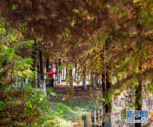 11月15日,游人在江蘇省泗洪縣洪澤湖濕地的杉樹林中游覽。初冬時節(jié),洪澤湖濕地中的杉樹林猶如披上多彩外衣,色彩斑斕,美不勝收。新華社發(fā)(許昌亮 攝)