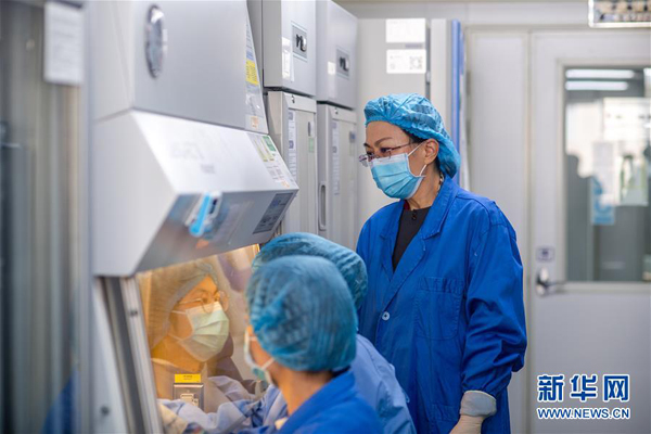 11月25日,云南省艾滋病專家咨詢委員會副主任委員賈曼紅(右)在指導工作人員進行實驗。 新華社記者 胡超 攝