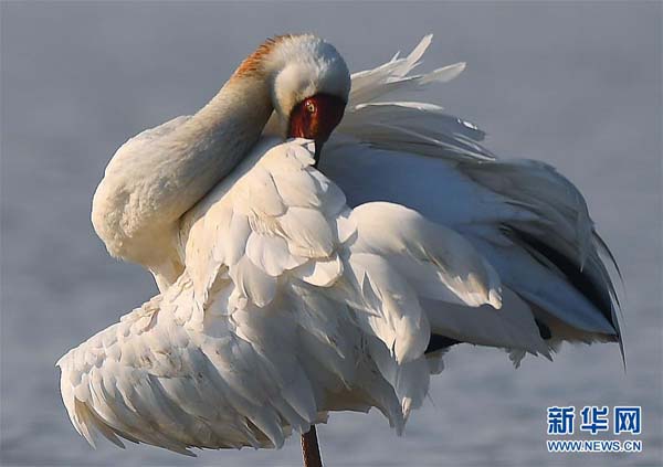 12月21日,白鶴在南昌五星白鶴保護小區(qū)的濕地中棲息。