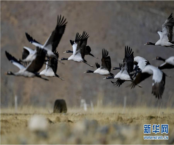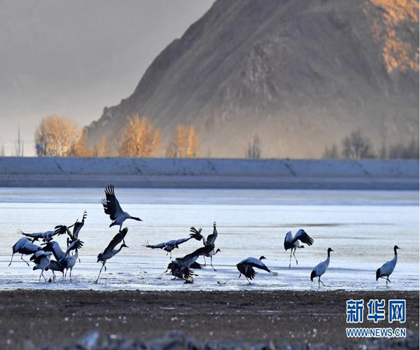 冬日,大批黑頸鶴在西藏拉薩市林周縣境內(nèi)棲息、覓食。 林周縣黑頸鶴自然保護(hù)區(qū)建立于1993年,2003年被設(shè)立為國(guó)家級(jí)自然保護(hù)區(qū),是雅魯藏布江中游自然保護(hù)區(qū)的核心部分,在每年的11月底至12月初,這里便會(huì)迎來(lái)成群的黑頸鶴過(guò)冬。
