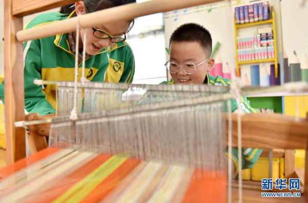 4月7日,威縣第四小學(xué)學(xué)生在體驗老粗布紡織技藝。近年來,河北省邢臺市威縣積極開展“非遺傳承進(jìn)校園”活動,將當(dāng)?shù)靥厣沁z項目引入學(xué)校課堂,讓學(xué)生近距離感受民間傳統(tǒng)技藝的魅力,促進(jìn)非遺文化的保護(hù)和傳承。新華社記者 朱旭東 攝