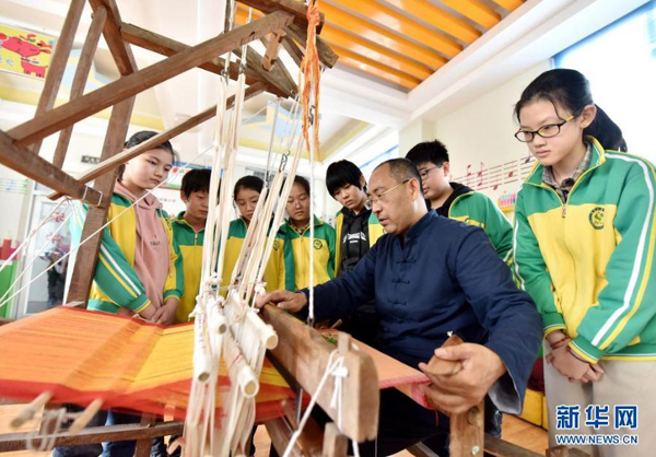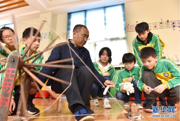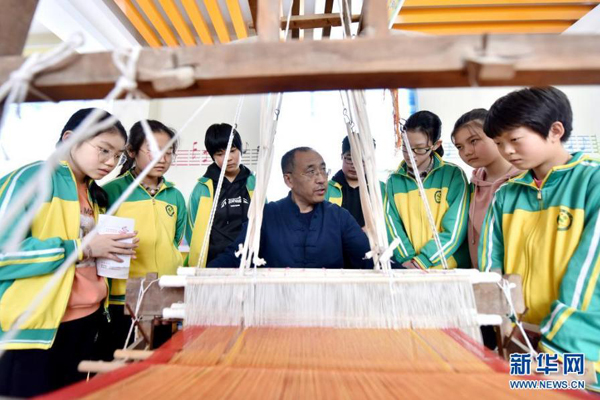4月7日,威縣土布紡織技藝傳承人高慶海在威縣第四小學(xué)向?qū)W生演示老粗布紡織技藝。近年來,河北省邢臺市威縣積極開展“非遺傳承進(jìn)校園”活動,將當(dāng)?shù)靥厣沁z項目引入學(xué)校課堂,讓學(xué)生近距離感受民間傳統(tǒng)技藝的魅力,促進(jìn)非遺文化的保護(hù)和傳承。新華社記者 朱旭東 攝