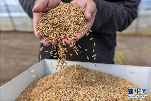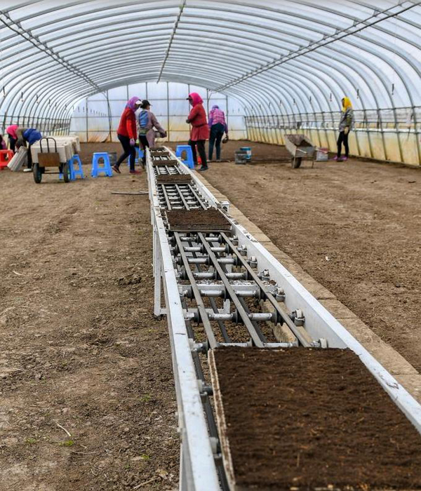 在吉林省吉林市永吉縣九月豐家庭農(nóng)場,水稻育秧生產(chǎn)線將種好種子的秧盤送到農(nóng)民手中(4月13日攝)。