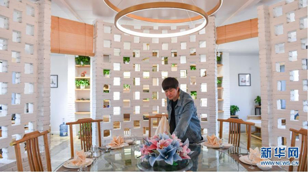 在吉林市船營區(qū)大綏河鎮(zhèn),創(chuàng)業(yè)者曹曦在民宿餐廳內(nèi)擺放餐具(4月20日攝)。