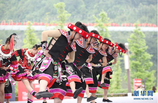 5月16日,演員在丹寨縣萬達小鎮(zhèn)非遺歌舞展演活動上表演苗族踩鼓舞。