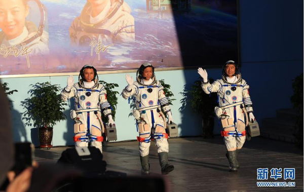 6月17日,神舟十二號航天員出征儀式在酒泉衛(wèi)星發(fā)射中心舉行。這是航天員聶海勝(中)、劉伯明(右)和湯洪波準(zhǔn)備出征。新華社記者 李剛 攝