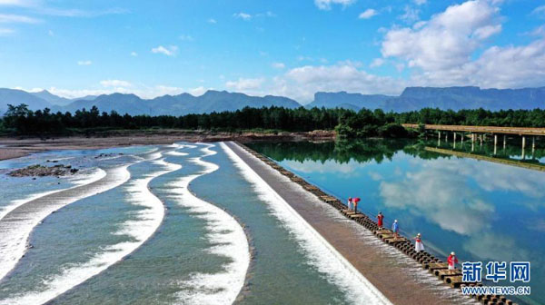 當日,浙江省臺州市仙居縣永安溪流域水面如鏡,藍天、白云倒影水中,構(gòu)成一幅美麗的畫卷。新華社發(fā)(王華斌 攝)
