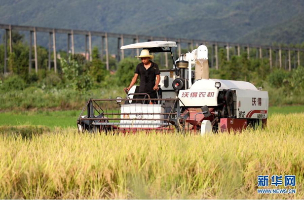 8月12日,在湖南省資興市三都鎮(zhèn),農(nóng)民駕駛收割機收割稻谷。