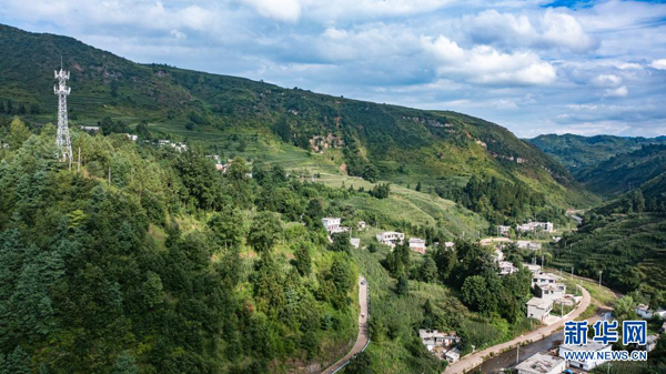 章忠武駕駛摩托車在前往羊場村村民家的盤山路上(8月16日攝,無人機(jī)照片)。新華社記者 陶亮 攝