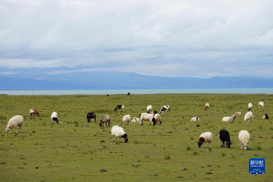 8月30日,雨后初晴,羊群在青海湖畔覓食。