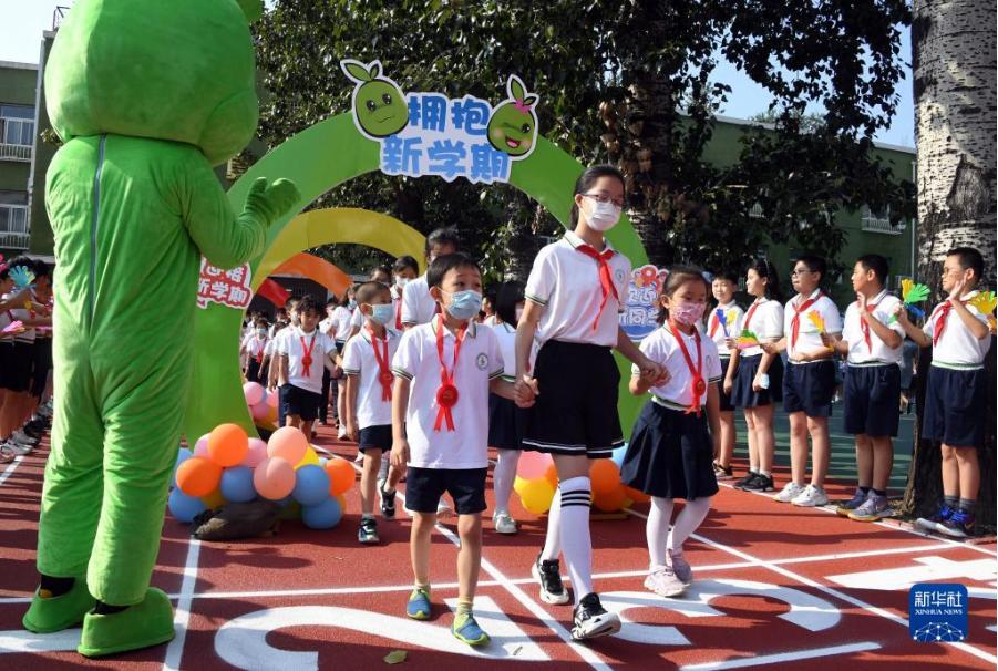 9月1日,在北京市海淀區(qū)太平路小學(xué),六年級(jí)學(xué)生帶領(lǐng)一年級(jí)新生走入開(kāi)學(xué)典禮現(xiàn)場(chǎng)。