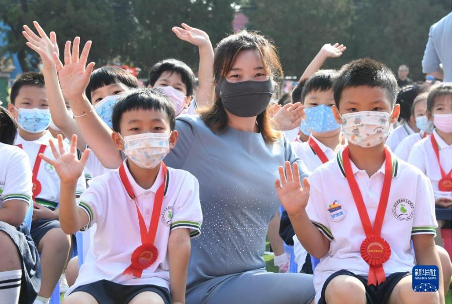 9月1日,在北京市海淀區(qū)太平路小學(xué),學(xué)生在開(kāi)學(xué)典禮中表演節(jié)目。