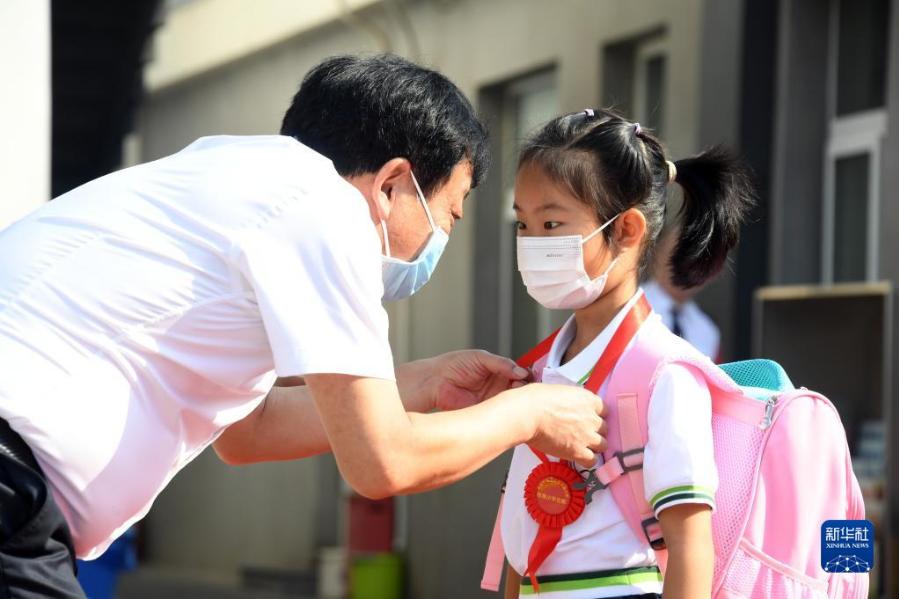 9月1日,在北京市海淀區(qū)太平路小學(xué),老師為一年級(jí)新生佩戴“小紅花”。
