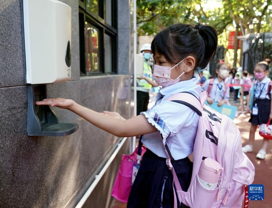 9月1日,上海市黃浦區(qū)盧灣二中心小學(xué)的學(xué)生入校后進(jìn)行手部消毒。