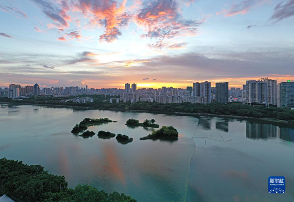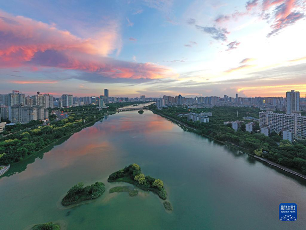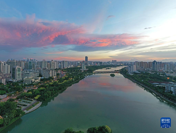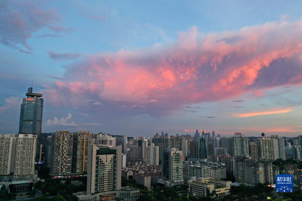 當(dāng)日,廣西南寧市天空出現(xiàn)絢麗晚霞。美麗晚霞掩映下的城市格外美麗。新華社記者 周華 攝