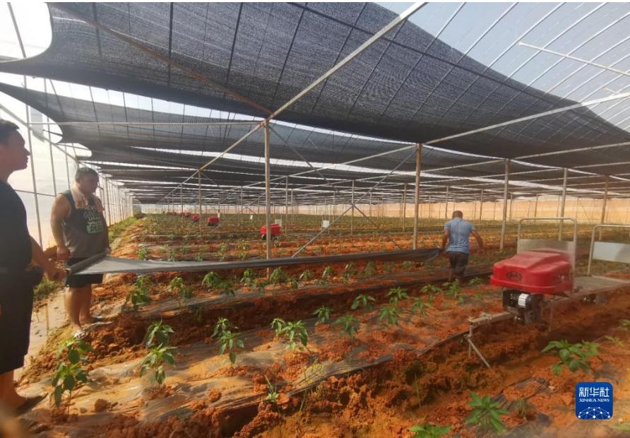 湖南省汨羅市白塘鎮(zhèn)的辣椒種植戶在大棚鋪設地膜(9月13日攝)。