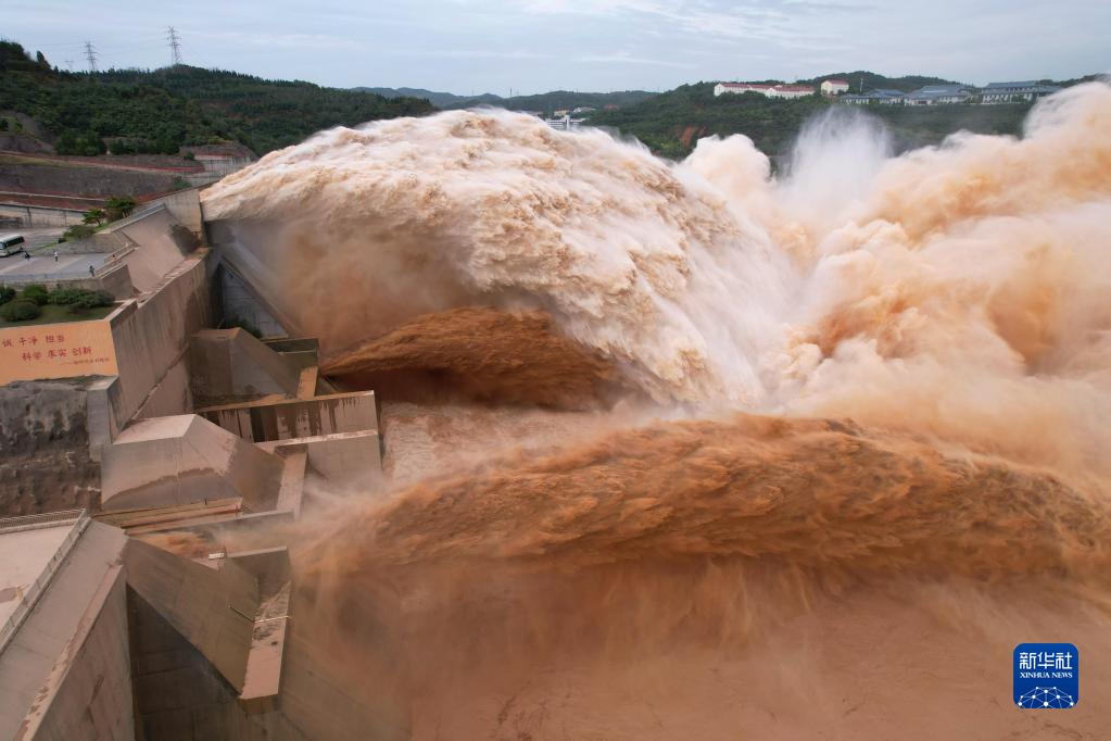 10月10日拍攝的黃河小浪底水庫泄洪場(chǎng)景(無人機(jī)照片)。新華社記者 劉詩平 攝