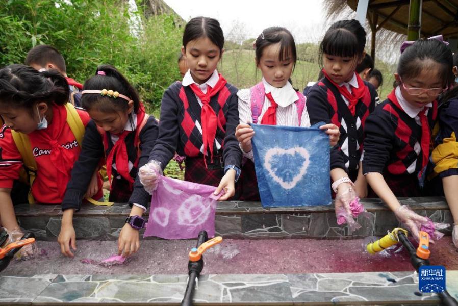 10月13日,在重慶市北碚區(qū)一個(gè)農(nóng)民創(chuàng)業(yè)園,孩子們?cè)隗w驗(yàn)蠟染技藝。