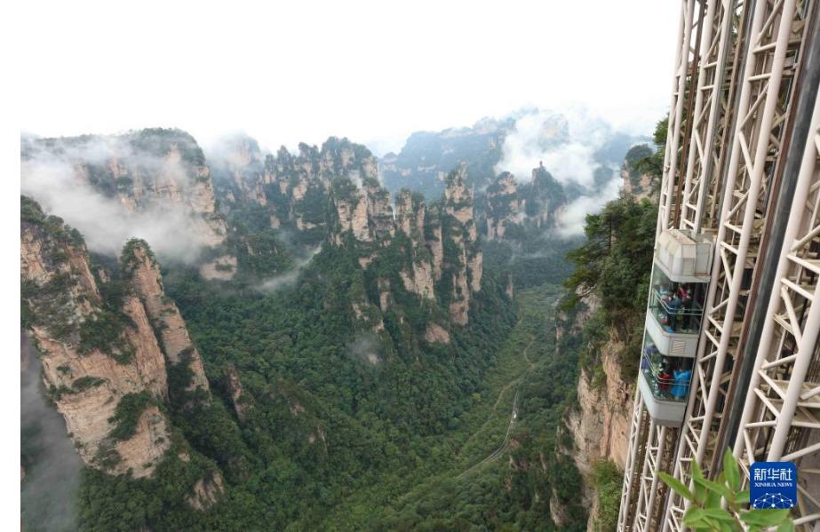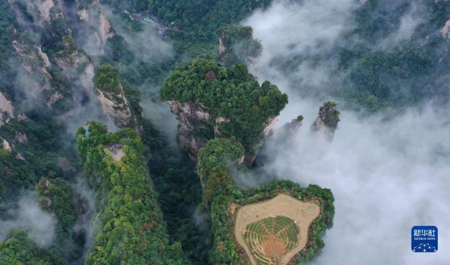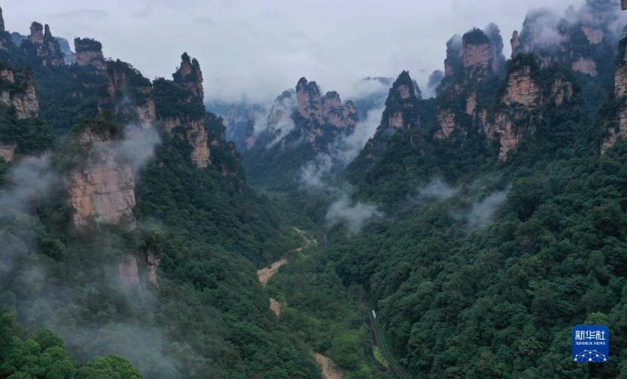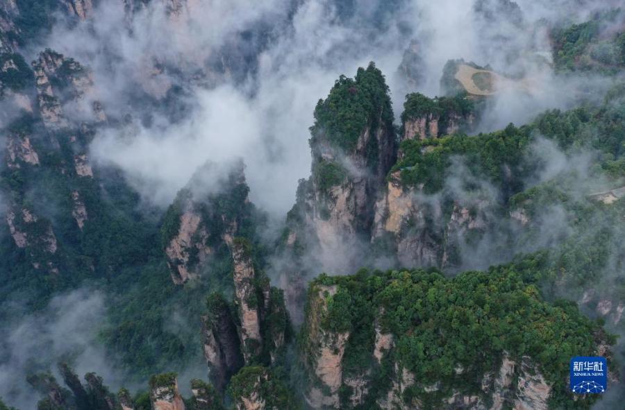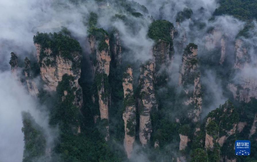 當日,雨后的湖南張家界武陵源,云霧飄蕩在峰林之間,若隱若現(xiàn),美不勝收(無人機照片)。新華社發(fā)(吳勇兵 攝)