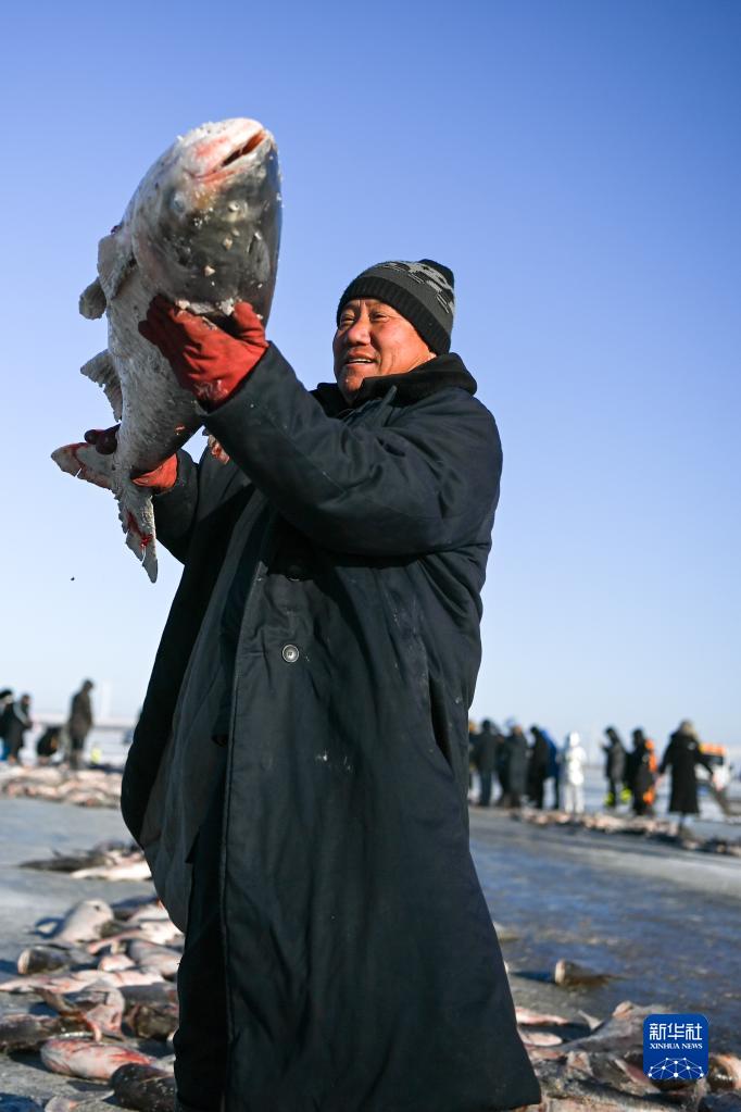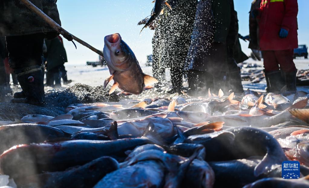 12月26日,在查干湖冰面上,漁民在做收網(wǎng)工作。