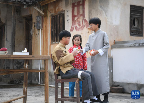 在廣東梅州大埔縣青溪鎮(zhèn)的紅色遺址棣萼樓,當(dāng)?shù)貙W(xué)生參與沉浸式研學(xué)活動,演繹地下交通員的故事(1月9日攝)。
