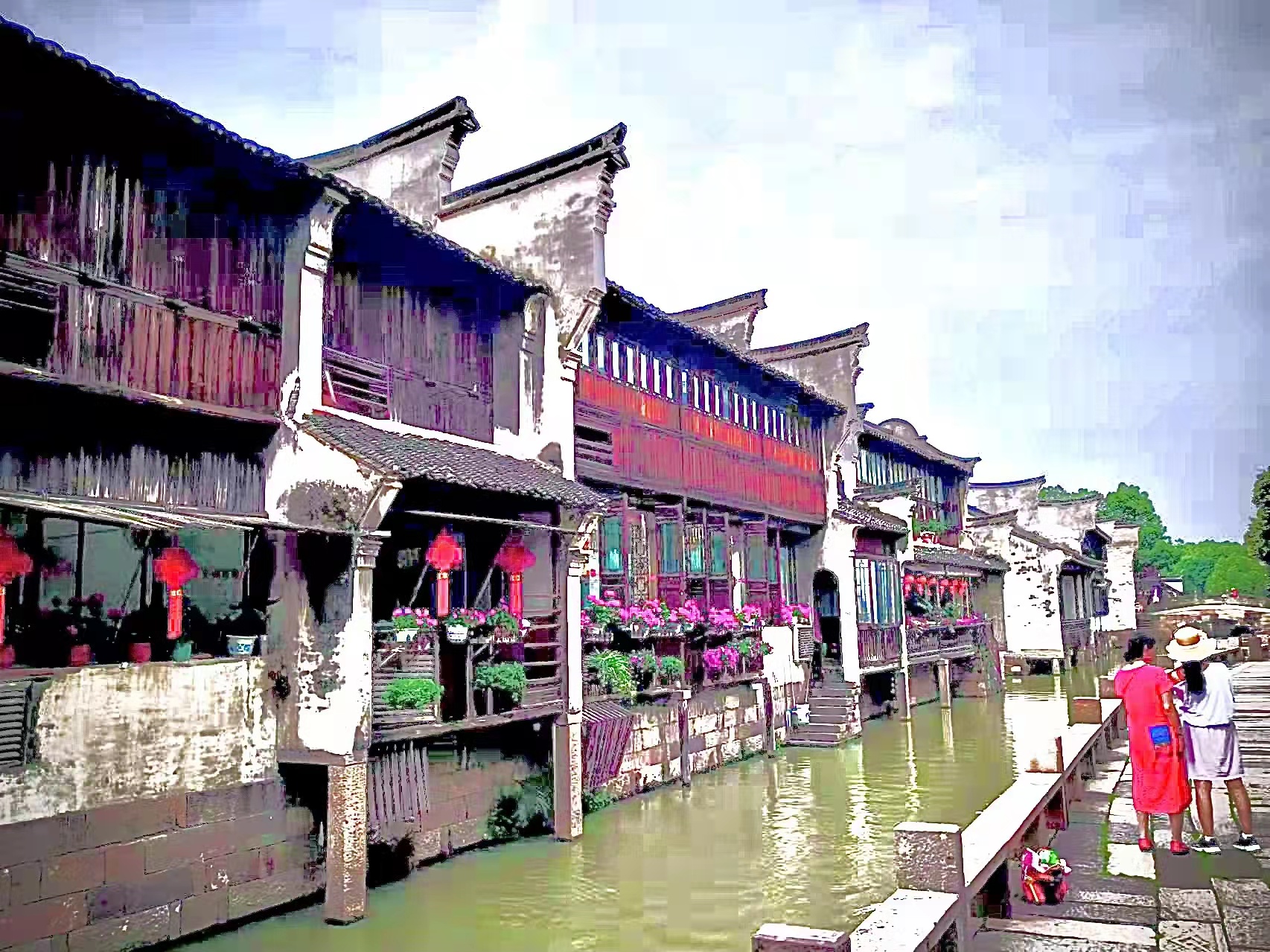 東柵白天很熱鬧,兩三米寬的觀前街已經(jīng)熙熙攘攘,摩肩接踵。帶團導游高舉著的旗子,是防止游客走散的標志,紅的綠的,多種多樣,有的導游在旗子頂端系一小玩具熊或小鳥的,增加辨識度。還有一位導游隨身攜帶的擴音機里模仿小品里黃世仁叫楊白勞的語調(diào)非常搞笑,來——來——來——,不急不躁,招呼著自己的人。游人們隨著人流參觀茅盾故居、茅盾紀念館、晴耕雨讀館、木雕館、印染坊……,還有坐在臨河長廊里,將小橋流水石階烏篷船寫進畫冊的寫生者。我泡杯茶,坐在小院里看門前來來往往的游客,差一點反客為主,客官從哪兒來?進來坐坐?十分愜意,感覺自己真的是先生的鄰居,老宅的主人。